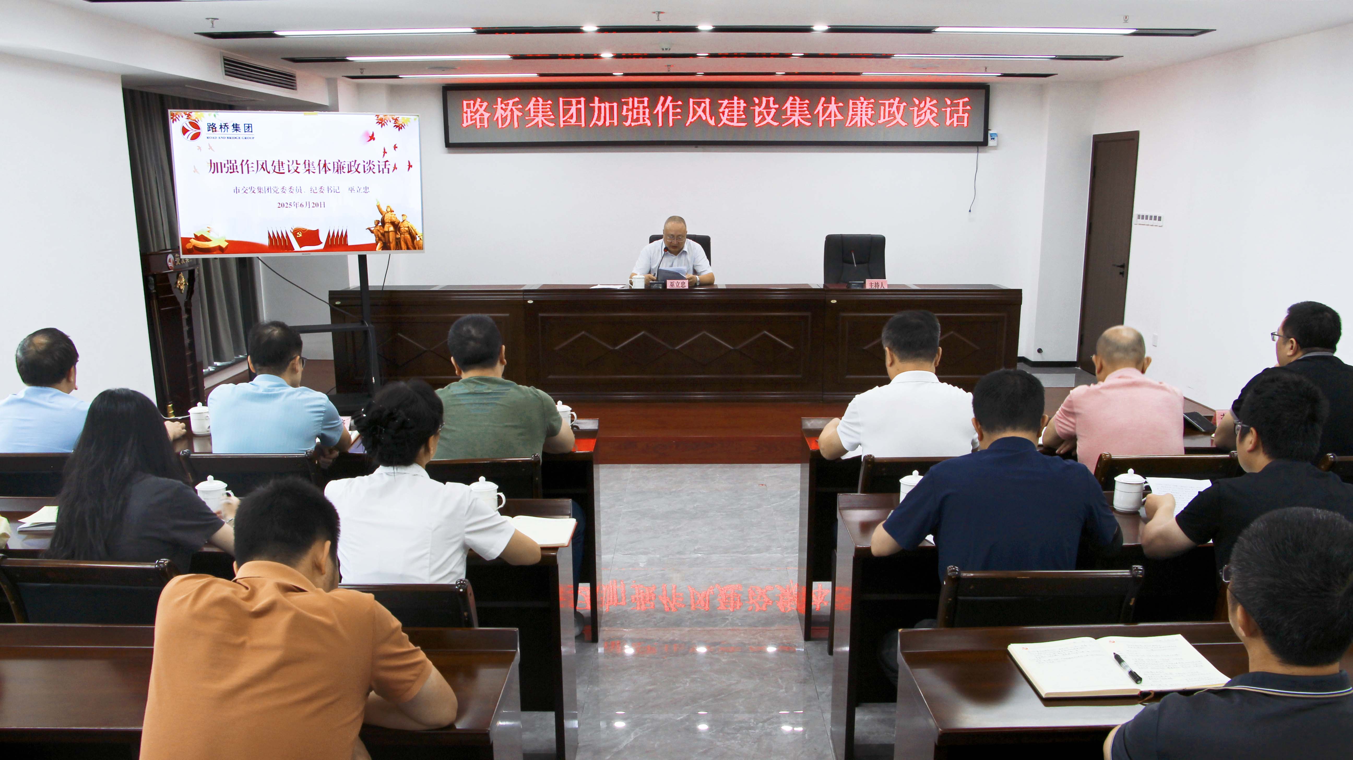 為深入貫徹落實全面從嚴治黨要求,持續(xù)推進深入貫徹中央八項規(guī)定精神學習教育,6月20日,市交發(fā)集團黨委委員、紀委書記巫立忠在路橋集團開展學習教育督導講話暨加強作風建設集體廉政談話,路橋集團黨委書記、董事長周家興主持會議。市交發(fā)集團紀檢監(jiān)察部、路橋集團領導班子成員、機關部門人員及權屬公司負責人參加會議。