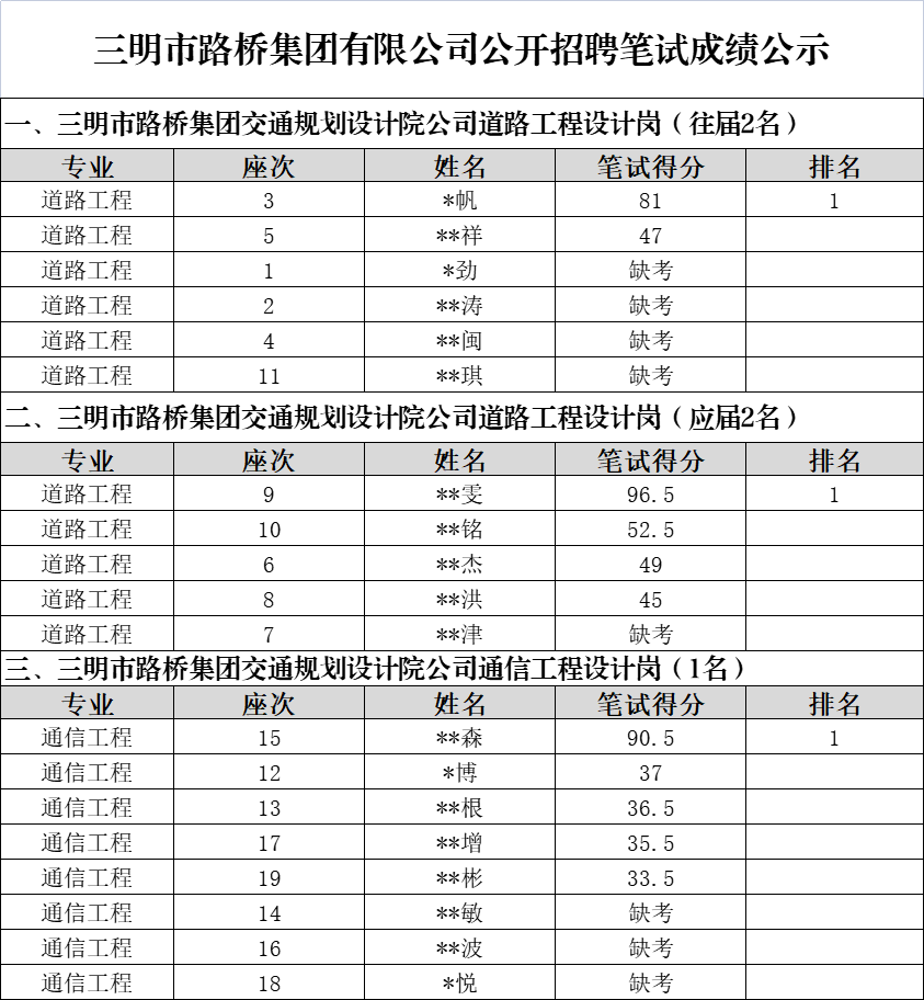 市路橋集團(tuán)公開招聘筆試環(huán)節(jié)已于2022年4月19日完成,現(xiàn)將筆試成績予以公示: