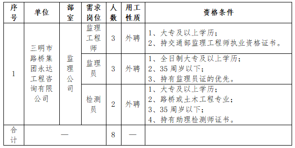 (一)公告。招聘崗位、人數(shù)、任職資格等信息在 “三明市路橋集團”官網(wǎng)(www.hexamethyldisilazane.com)、眾聯(lián)人才招聘網(wǎng)(www.zlrczp.com)、“三明海峽人才網(wǎng)”、“一覽英才網(wǎng)”官網(wǎng)向社會統(tǒng)一公告。