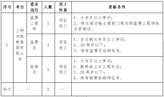 (二)報(bào)名。采取網(wǎng)絡(luò)報(bào)名方式,請(qǐng)應(yīng)聘者下載填寫《三明市路橋集團(tuán)有限公司公開招聘工作人員報(bào)名登記表》(附件),投遞至郵箱smslqjt@163.com(文件命名為“姓名+應(yīng)聘崗位”)。報(bào)名截止時(shí)間為2022年7月29日。