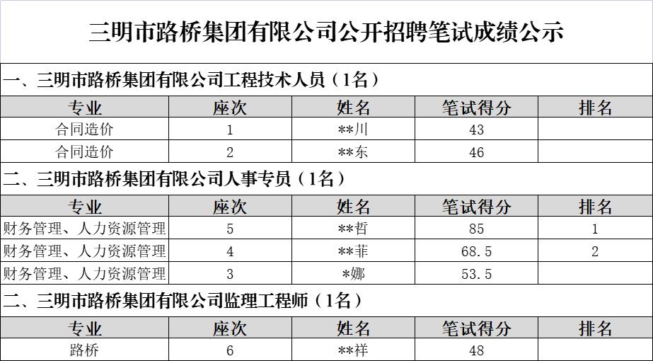 市路橋集團(tuán)公開招聘筆試環(huán)節(jié)已于2022年10月11日完成,現(xiàn)將筆試成績予以公示: