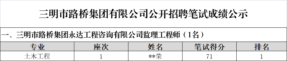 市路橋集團公開招聘筆試環(huán)節(jié)已于2023年5月19日完成,現(xiàn)將筆試成績予以公示: