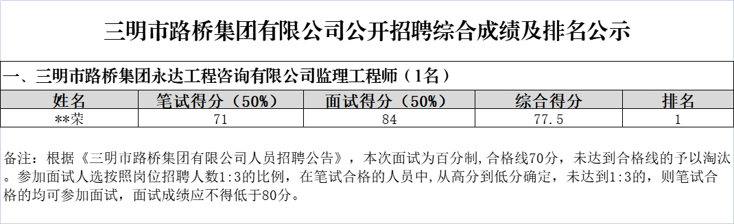 根據(jù)《市路橋集團(tuán)有限公司人員招聘公告》,現(xiàn)將市路橋集團(tuán)有限公司公開招聘工作人員綜合成績及排名情況公示如下: