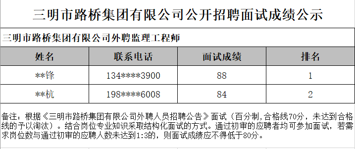 市路橋集團(tuán)永達(dá)工程咨詢有限公司外聘人員招聘面試環(huán)節(jié)已于2023年11月24日完成,現(xiàn)將面試成績予以公示:
