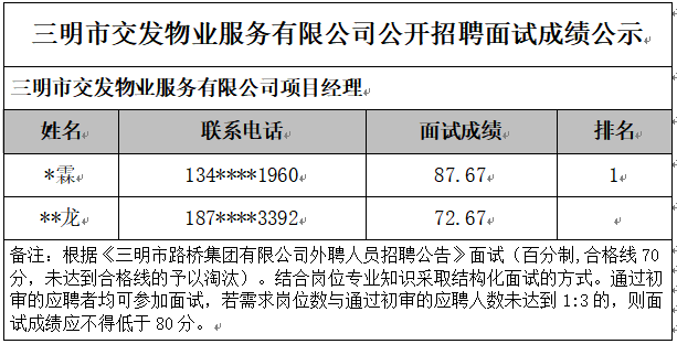 市交發(fā)物業(yè)服務(wù)有限公司公開招聘面試環(huán)節(jié)已于2024年12月26日完成,現(xiàn)將面試成績予以公示: