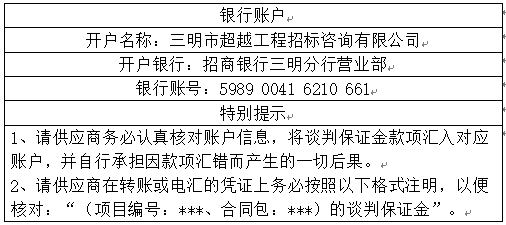 6.2采購文件發(fā)售地點:三明市超越工程招標咨詢有限公司(地址:三明市三元區(qū)東乾路192號(匯鑫大廈)2606號)購買或?qū)①徺I費用轉(zhuǎn)賬至以下賬戶: